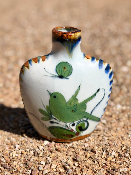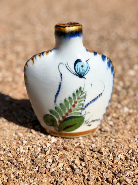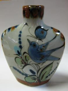 This handcrafted vase is completely hand decorated by the artisans at Ken Edwards. Each Ken Edwards piece is a unique piece of art, and completely lead-free. This piece measures approximately 2.25" across the top, 4.5" wide across the front, and 5.75" tall.