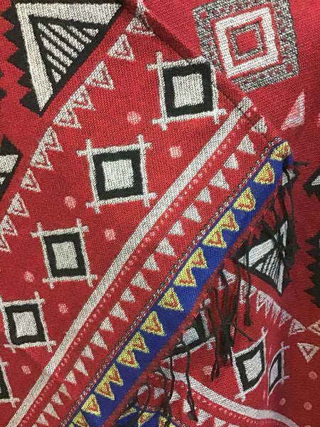 Wrap yourself in the warmth and spirit of the Southwest with this eye-catching poncho, crafted for comfort, character, and style. Featuring a rich blend of vibrant colors—sunset reds, desert oranges, turquoise blues, earthy browns, and deep charcoals—this poncho captures the essence of Southwestern landscapes and traditional patterns.