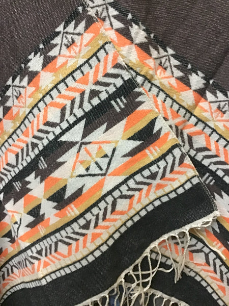 Wrap yourself in the warmth and spirit of the Southwest with this eye-catching poncho, crafted for comfort, character, and style. Featuring a rich blend of vibrant colors—sunset reds, desert oranges, turquoise blues, earthy browns, and deep charcoals—this poncho captures the essence of Southwestern landscapes and traditional pattern
